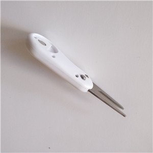 To open just push the button and to close fold the pitch fork back