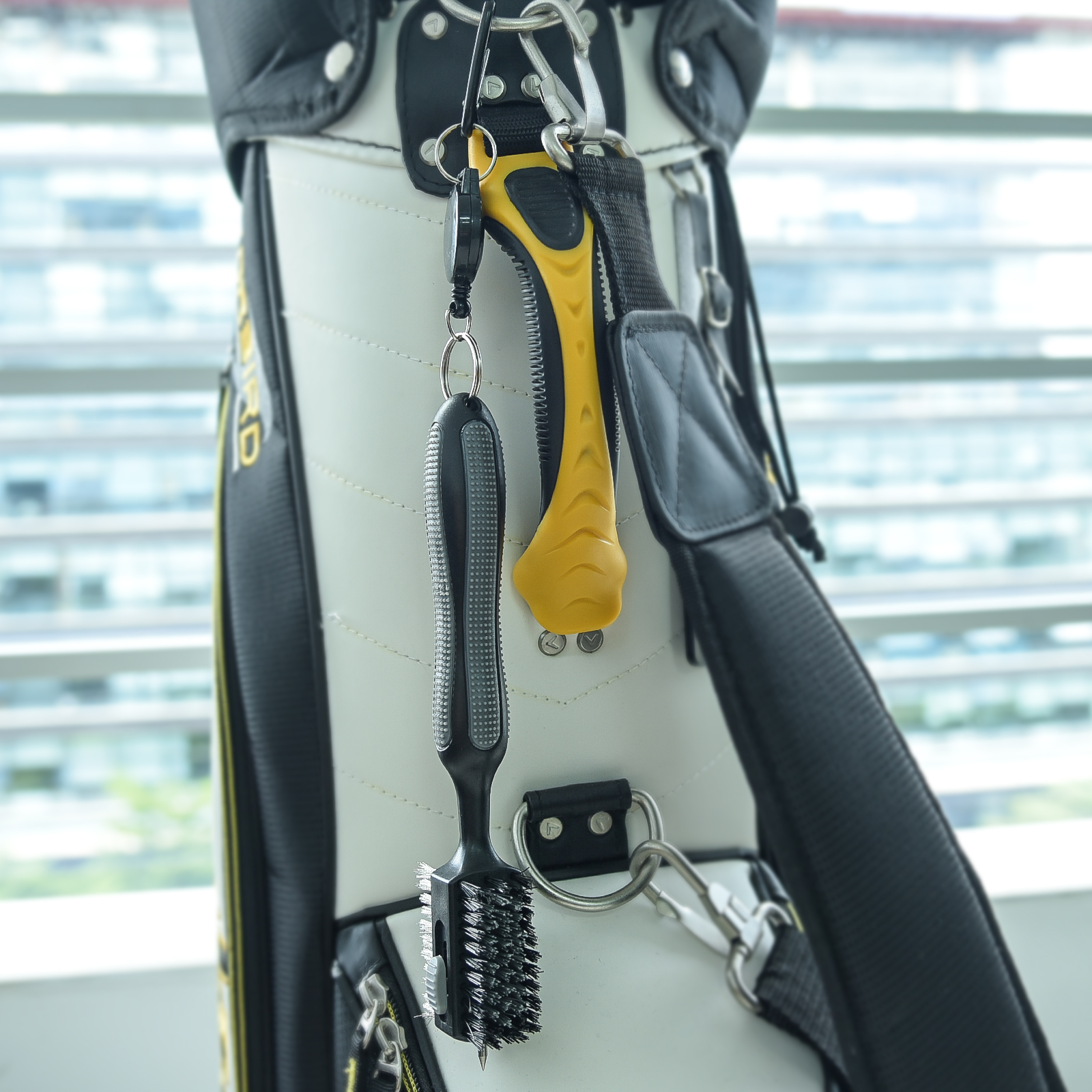 RETRACTABLE HIKING BUCKLE ---- Consists of a sturdy aluminum hiking buckle and a retractable zipline, retractable lanyard can extend up to 2 ft. Allows you to easily attach the cleaning tool to the golf bag for easy access at any time. It can be immediately retracted and hung on the golf bag when it is used up, and it is not easy to lose it on the course.