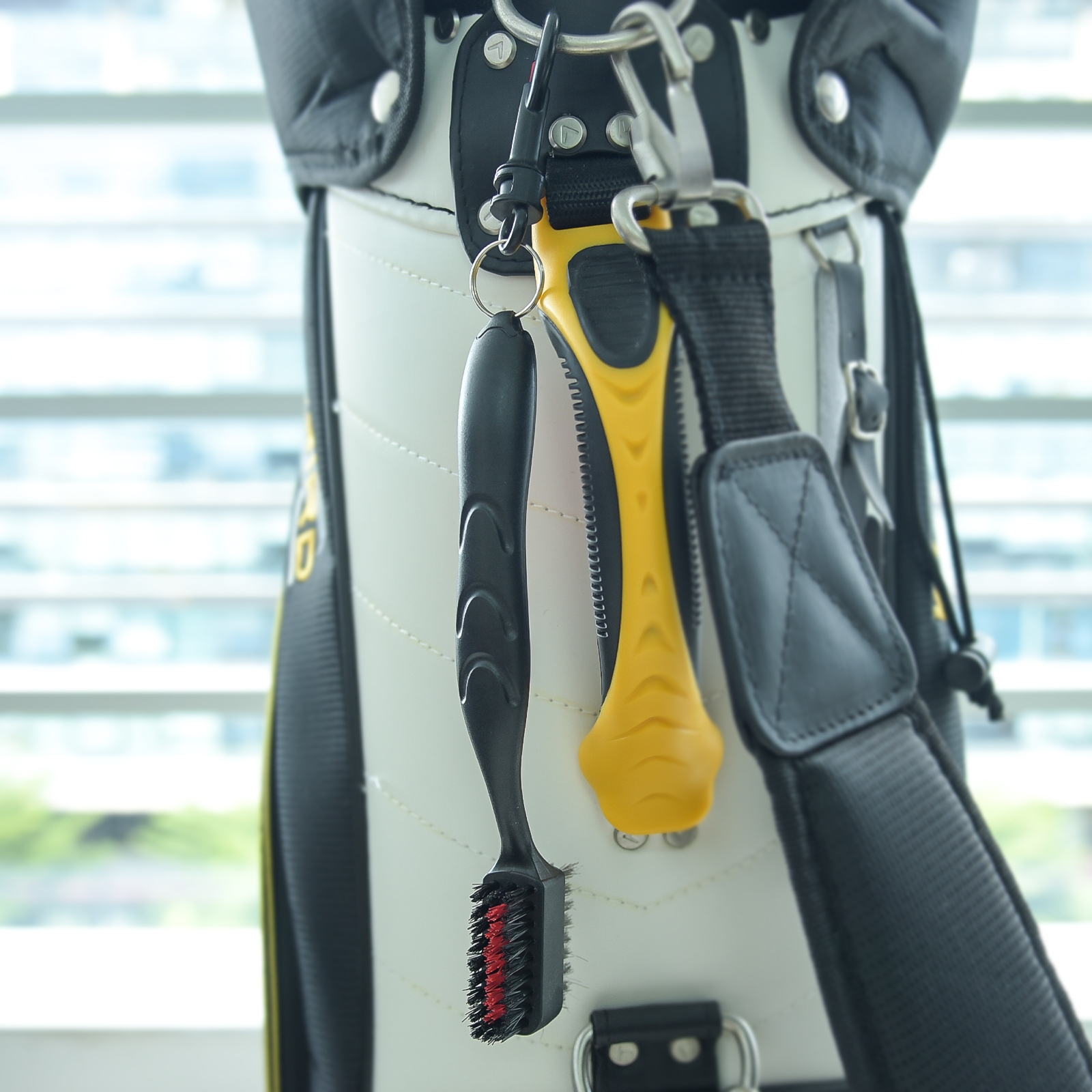 Attaches to golf bag with sturdy plastic clip