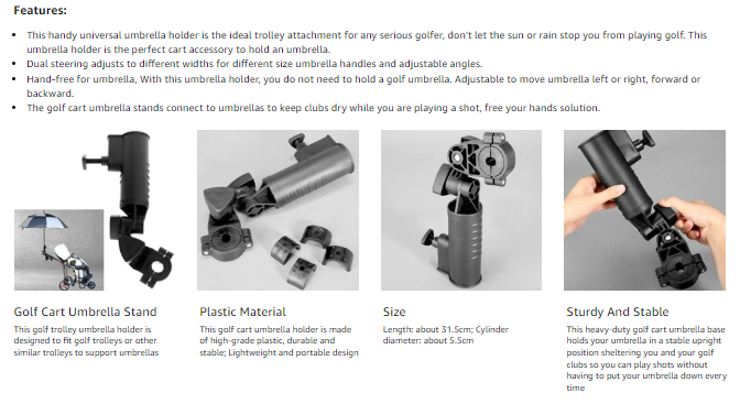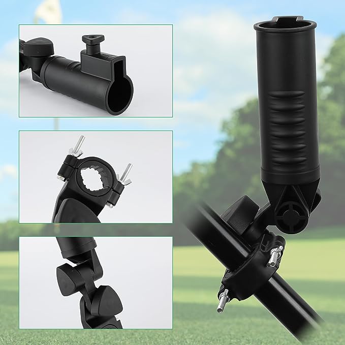 【Application】The golf bag stand attachment is suitable for golf cart umbrellas that have a rounded handle or golf trolleys or other similar trolleys. It is an essential tool for golf courses. All our products have passed the inspection before shipment, so please feel free to purchase. If you find any defective products due to manufacturing reasons, please contact us. We will do our best to solve your problem.